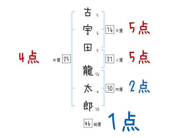 天運![]() | 古宇田龍太郎さんの天運は16画の5つ星!人望が厚く大きく発展する。逆転成功が見える。 家系が持つ宿命的な運勢を表します。祖先から受け継いだ苗字ですので自分の力が及びません。家柄を象徴します。 |