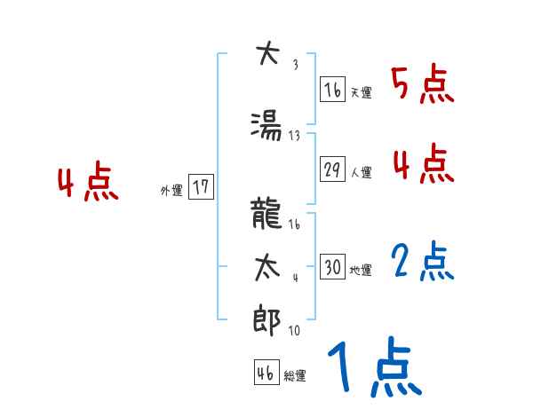 外運![]() | 大湯龍太郎さんの外運は17画の4つ星!積極的な行動力。地位を気づき財産を手に入れる。純粋な心と直感力。 生活面を象徴する運勢です。外部から受ける影響力を表し、結婚運、家庭運や職場、環境への順応性を表します。 |