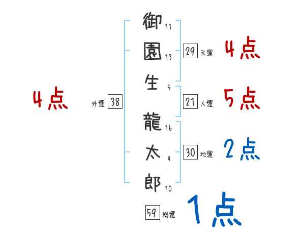 天運![]() | 御園生龍太郎さんの天運は29画の4つ星!完全主義で才能がある。厳格な心の持ち主。 家系が持つ宿命的な運勢を表します。祖先から受け継いだ苗字ですので自分の力が及びません。家柄を象徴します。 |
