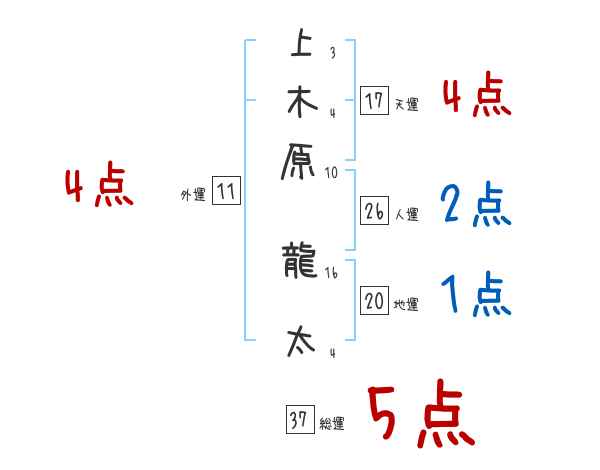 天運![]() | 上木原龍太さんの天運は17画の4つ星!積極的な行動力。地位を気づき財産を手に入れる。純粋な心と直感力。 家系が持つ宿命的な運勢を表します。祖先から受け継いだ苗字ですので自分の力が及びません。家柄を象徴します。 |