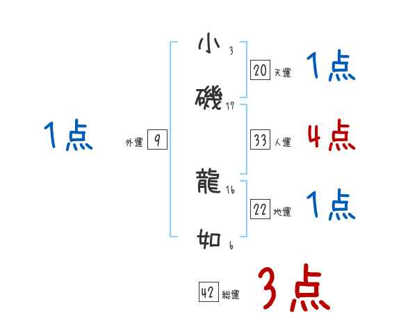 外運![]() | 小磯龍如さんの外運は9画の1つ星!消極的で才能を発揮することが苦手なことも。周りの意見に耳を傾けましょう。 生活面を象徴する運勢です。外部から受ける影響力を表し、結婚運、家庭運や職場、環境への順応性を表します。 |