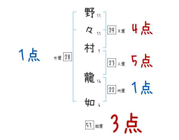 外運![]() | 野々村龍如さんの外運は28画の1つ星!家庭環境に注意。スポーツで活躍できる能力があるかも。 生活面を象徴する運勢です。外部から受ける影響力を表し、結婚運、家庭運や職場、環境への順応性を表します。 |