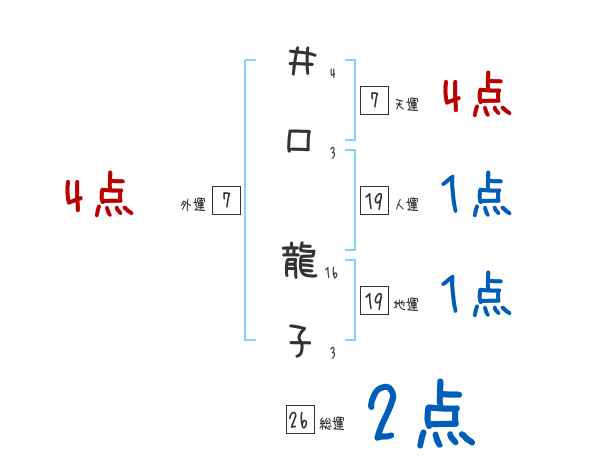 外運![]() | 井口龍子さんの外運は7画の4つ星!強い意志や信念を持ち独立心が強い。自立する。 生活面を象徴する運勢です。外部から受ける影響力を表し、結婚運、家庭運や職場、環境への順応性を表します。 |