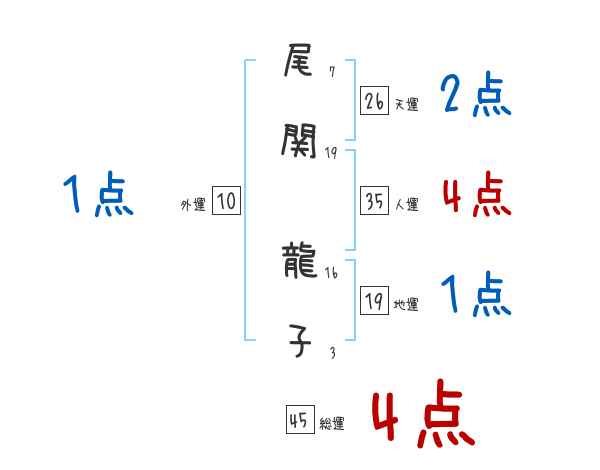 外運![]() | 尾関龍子さんの外運は10画の1つ星!不安を感じやすい傾向。ストレスを抱えないように注意しましょう。 生活面を象徴する運勢です。外部から受ける影響力を表し、結婚運、家庭運や職場、環境への順応性を表します。 |