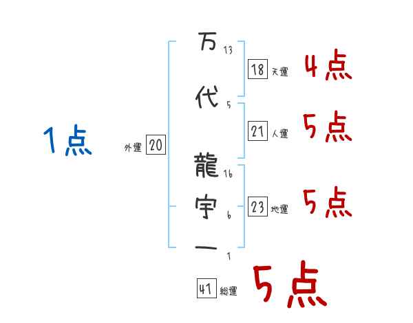 天運![]() | 万代龍宇一さんの天運は18画の4つ星!情熱的で剛気。忍耐力があり信頼される。 家系が持つ宿命的な運勢を表します。祖先から受け継いだ苗字ですので自分の力が及びません。家柄を象徴します。 |