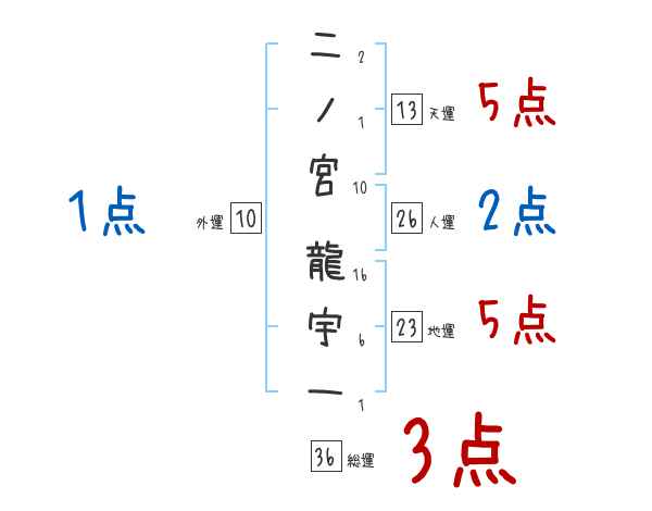 天運![]() | 二ノ宮龍宇一さんの天運は13画の5つ星!才能に恵まれ人気がある。名声を手に入れる。円満な人生。 家系が持つ宿命的な運勢を表します。祖先から受け継いだ苗字ですので自分の力が及びません。家柄を象徴します。 |