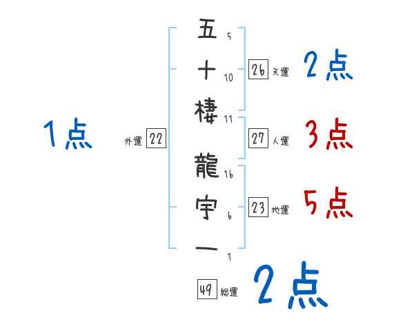 外運![]() | 五十棲龍宇一さんの外運は22画の1つ星!努力することが苦手ないっぽう手先が器用。芸術性にも優れる。 生活面を象徴する運勢です。外部から受ける影響力を表し、結婚運、家庭運や職場、環境への順応性を表します。 |