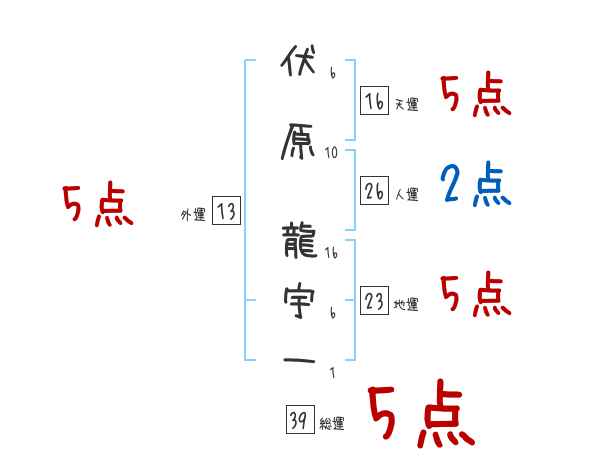 総運![]() | 伏原龍宇一さんの総運は39画の5つ星!社交性に優れ人望が厚い。人の上に立ち成功する。 あなたの人生を表す1番重要な運勢です。生涯を通じて影響する総合運となり、主に50歳以降の晩年期に影響を及ぼします。 |