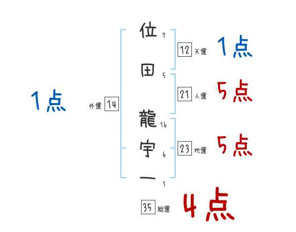 天運![]() | 位田龍宇一さんの天運は12画の1つ星!簡単な失敗で諦めてしまいやすいかも。着実に行動すると良いでしょう。 家系が持つ宿命的な運勢を表します。祖先から受け継いだ苗字ですので自分の力が及びません。家柄を象徴します。 |