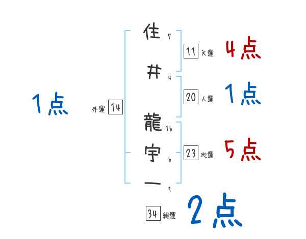 天運![]() | 住井龍宇一さんの天運は11画の4つ星!着実に富や地位を得る幸運な人生。 家系が持つ宿命的な運勢を表します。祖先から受け継いだ苗字ですので自分の力が及びません。家柄を象徴します。 |