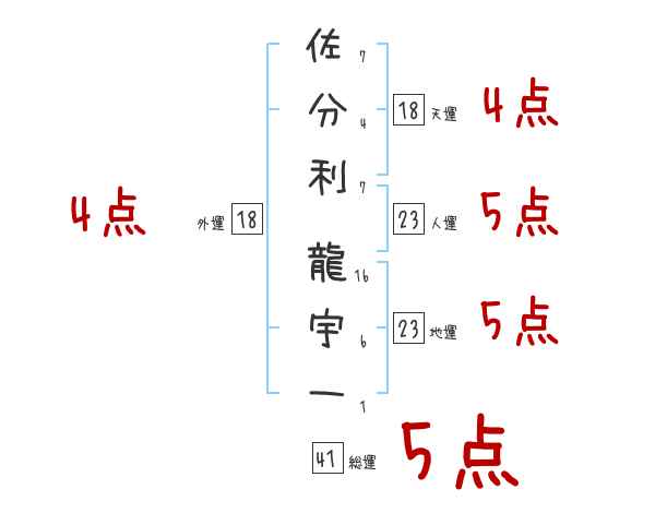 天運![]() | 佐分利龍宇一さんの天運は18画の4つ星!情熱的で剛気。忍耐力があり信頼される。 家系が持つ宿命的な運勢を表します。祖先から受け継いだ苗字ですので自分の力が及びません。家柄を象徴します。 |