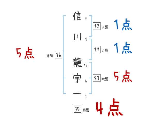 外運![]() | 信川龍宇一さんの外運は16画の5つ星!人望が厚く大きく発展する。逆転成功が見える。 生活面を象徴する運勢です。外部から受ける影響力を表し、結婚運、家庭運や職場、環境への順応性を表します。 |