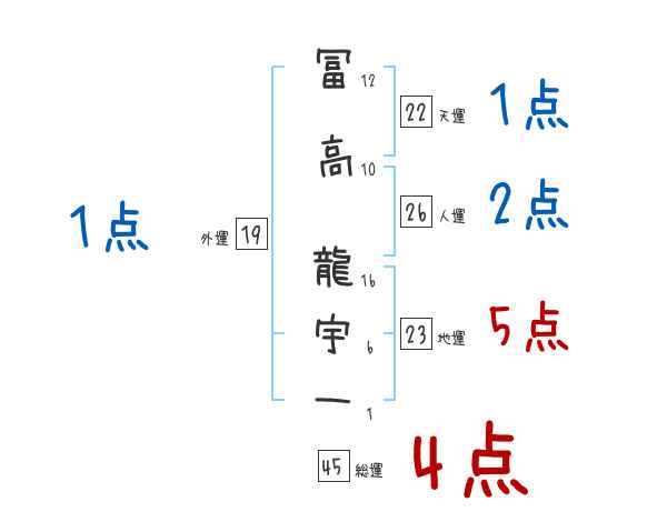 外運![]() | 冨高龍宇一さんの外運は19画の1つ星!優れた才能を持ちますが、協調性が足りないことも。周りの人と協力する事を意識しましょう。 生活面を象徴する運勢です。外部から受ける影響力を表し、結婚運、家庭運や職場、環境への順応性を表します。 |