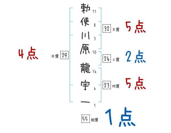 天運![]() | 勅使川原龍宇一さんの天運は32画の5つ星!柔軟性があり成功する。チャンスが多く金運が良い。 家系が持つ宿命的な運勢を表します。祖先から受け継いだ苗字ですので自分の力が及びません。家柄を象徴します。 |