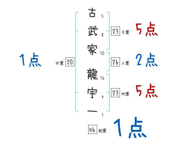 天運![]() | 古武家龍宇一さんの天運は23画の5つ星!想像力に優れ活力がある。一代で成功し名誉を手に入れる。 家系が持つ宿命的な運勢を表します。祖先から受け継いだ苗字ですので自分の力が及びません。家柄を象徴します。 |