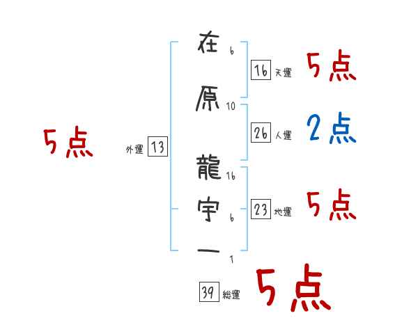 地運![]() | 在原龍宇一さんの地運は23画の5つ星!想像力に優れ活力がある。一代で成功し名誉を手に入れる。 個性を表す基礎的な運勢です。性格形成や対人関係、行動力など家庭環境に影響されます。主に誕生してから20歳くらいまでの若年期の運勢を表します。 |