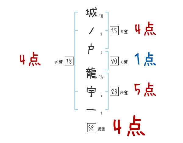地運![]() | 城ノ戸龍宇一さんの地運は23画の5つ星!想像力に優れ活力がある。一代で成功し名誉を手に入れる。 個性を表す基礎的な運勢です。性格形成や対人関係、行動力など家庭環境に影響されます。主に誕生してから20歳くらいまでの若年期の運勢を表します。 |