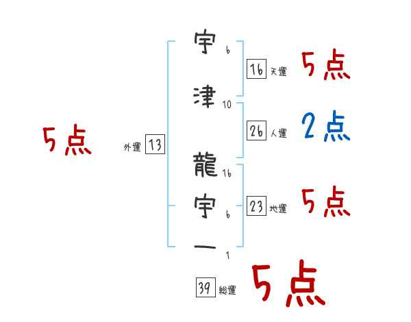 天運![]() | 宇津龍宇一さんの天運は16画の5つ星!人望が厚く大きく発展する。逆転成功が見える。 家系が持つ宿命的な運勢を表します。祖先から受け継いだ苗字ですので自分の力が及びません。家柄を象徴します。 |