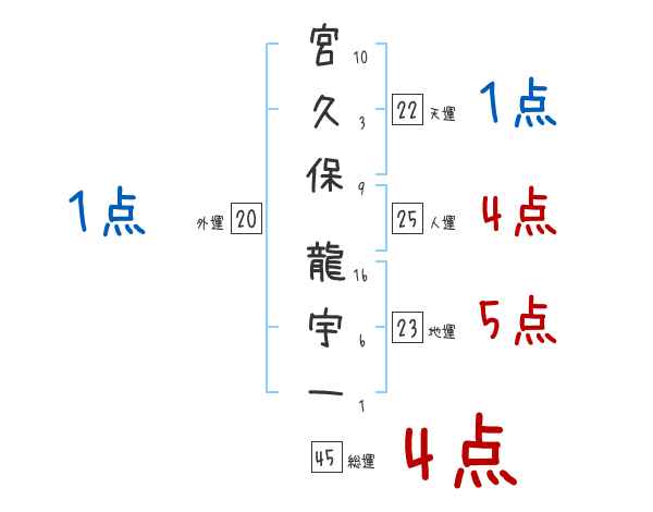 天運![]() | 宮久保龍宇一さんの天運は22画の1つ星!努力することが苦手ないっぽう手先が器用。芸術性にも優れる。 家系が持つ宿命的な運勢を表します。祖先から受け継いだ苗字ですので自分の力が及びません。家柄を象徴します。 |