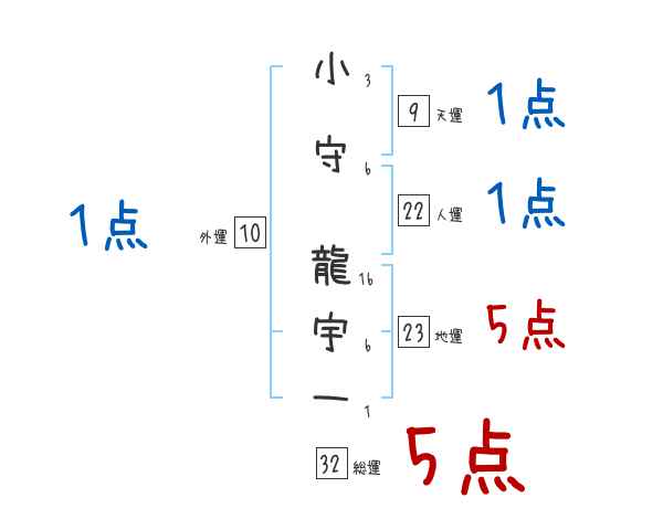 総運![]() | 小守龍宇一さんの総運は32画の5つ星!柔軟性があり成功する。チャンスが多く金運が良い。 あなたの人生を表す1番重要な運勢です。生涯を通じて影響する総合運となり、主に50歳以降の晩年期に影響を及ぼします。 |