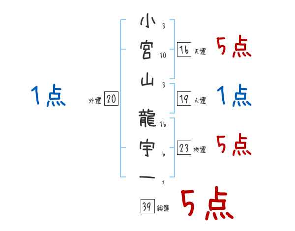 天運![]() | 小宮山龍宇一さんの天運は16画の5つ星!人望が厚く大きく発展する。逆転成功が見える。 家系が持つ宿命的な運勢を表します。祖先から受け継いだ苗字ですので自分の力が及びません。家柄を象徴します。 |