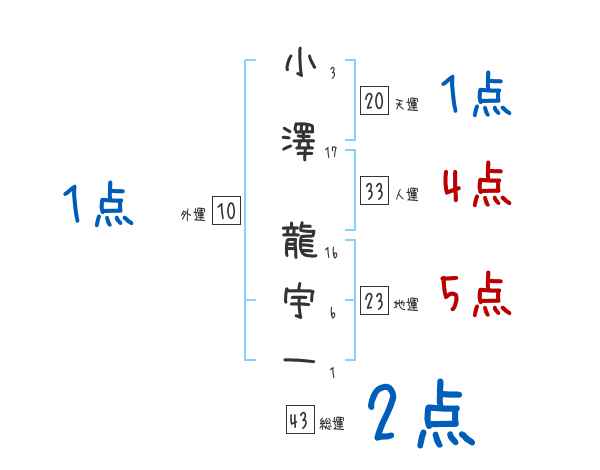 天運![]()  | 小澤龍宇一さんの天運は20画の1つ星!社交が苦手。人とは違った才能があり波乱万丈な人生かも。 家系が持つ宿命的な運勢を表します。祖先から受け継いだ苗字ですので自分の力が及びません。家柄を象徴します。 |