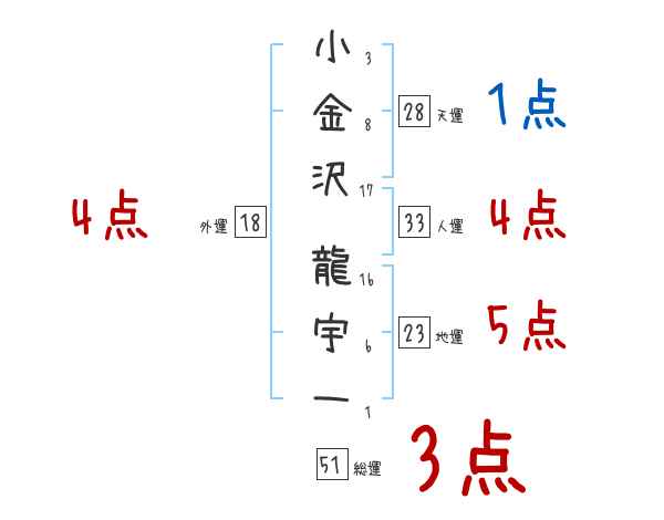 総運![]() | 小金沢龍宇一さんの総運は51画の3つ星!変化が激しく、危険に注意。堅実な性格。 あなたの人生を表す1番重要な運勢です。生涯を通じて影響する総合運となり、主に50歳以降の晩年期に影響を及ぼします。 |