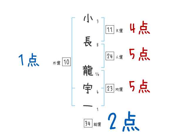 総運![]() | 小長龍宇一さんの総運は34画の2つ星!独創性に優れるが、自尊心が強く災難に注意しましょう。 あなたの人生を表す1番重要な運勢です。生涯を通じて影響する総合運となり、主に50歳以降の晩年期に影響を及ぼします。 |