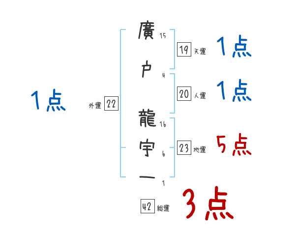 外運![]() | 廣戸龍宇一さんの外運は22画の1つ星!努力することが苦手ないっぽう手先が器用。芸術性にも優れる。 生活面を象徴する運勢です。外部から受ける影響力を表し、結婚運、家庭運や職場、環境への順応性を表します。 |