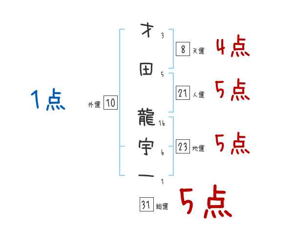 人運![]() | 才田龍宇一さんの人運は21画の5つ星!統率力がある。独立し成功する。名誉を手に入れる。 性格や才能などを表す2番目に重要な運勢です。人間関係や協調性、社会的な成功に影響します。主に20歳から50歳ぐらいまでの中年期の運勢を表します。 |