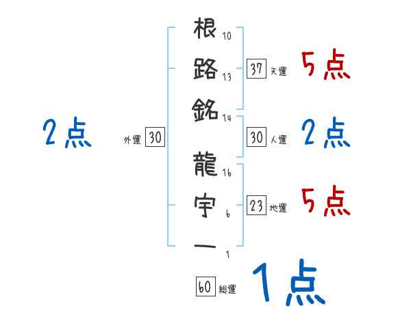 地運![]() | 根路銘龍宇一さんの地運は23画の5つ星!想像力に優れ活力がある。一代で成功し名誉を手に入れる。 個性を表す基礎的な運勢です。性格形成や対人関係、行動力など家庭環境に影響されます。主に誕生してから20歳くらいまでの若年期の運勢を表します。 |
