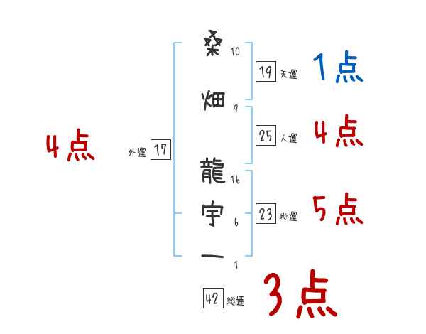 外運![]() | 桑畑龍宇一さんの外運は17画の4つ星!積極的な行動力。地位を気づき財産を手に入れる。純粋な心と直感力。 生活面を象徴する運勢です。外部から受ける影響力を表し、結婚運、家庭運や職場、環境への順応性を表します。 |