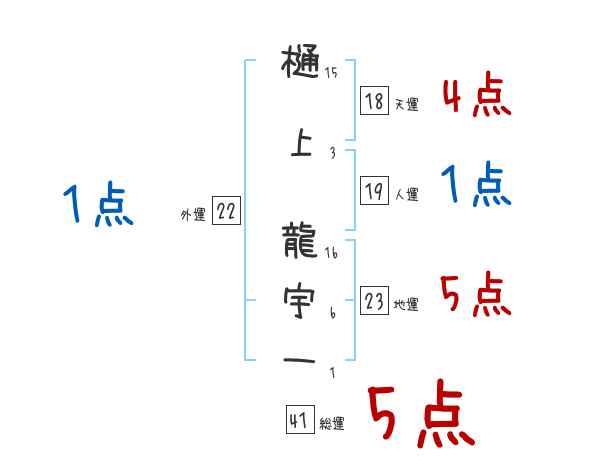外運![]() | 樋上龍宇一さんの外運は22画の1つ星!努力することが苦手ないっぽう手先が器用。芸術性にも優れる。 生活面を象徴する運勢です。外部から受ける影響力を表し、結婚運、家庭運や職場、環境への順応性を表します。 |