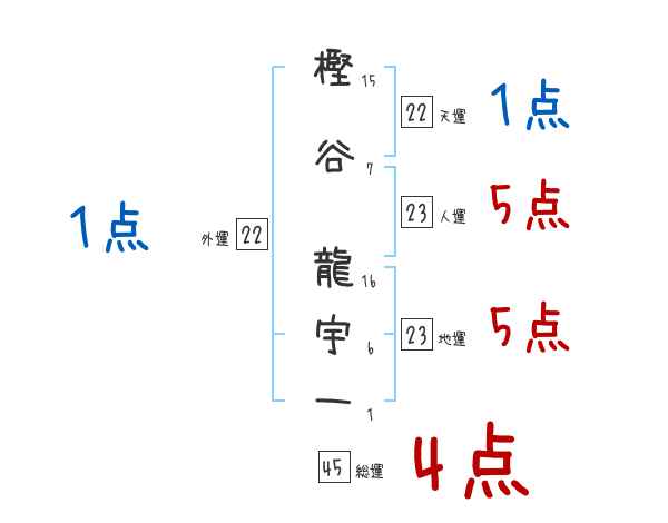 外運![]() | 樫谷龍宇一さんの外運は22画の1つ星!努力することが苦手ないっぽう手先が器用。芸術性にも優れる。 生活面を象徴する運勢です。外部から受ける影響力を表し、結婚運、家庭運や職場、環境への順応性を表します。 |