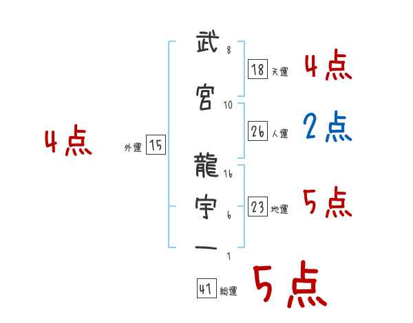 天運![]() | 武宮龍宇一さんの天運は18画の4つ星!情熱的で剛気。忍耐力があり信頼される。 家系が持つ宿命的な運勢を表します。祖先から受け継いだ苗字ですので自分の力が及びません。家柄を象徴します。 |