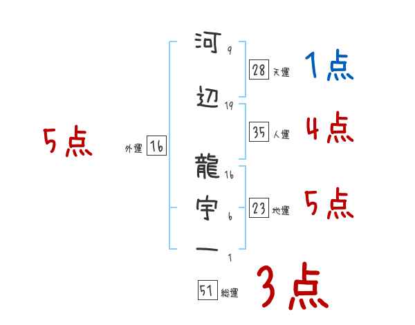 天運![]() | 河辺龍宇一さんの天運は28画の1つ星!家庭環境に注意。スポーツで活躍できる能力があるかも。 家系が持つ宿命的な運勢を表します。祖先から受け継いだ苗字ですので自分の力が及びません。家柄を象徴します。 |