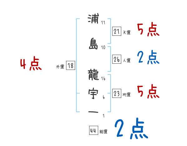 天運![]() | 浦島龍宇一さんの天運は21画の5つ星!統率力がある。独立し成功する。名誉を手に入れる。 家系が持つ宿命的な運勢を表します。祖先から受け継いだ苗字ですので自分の力が及びません。家柄を象徴します。 |