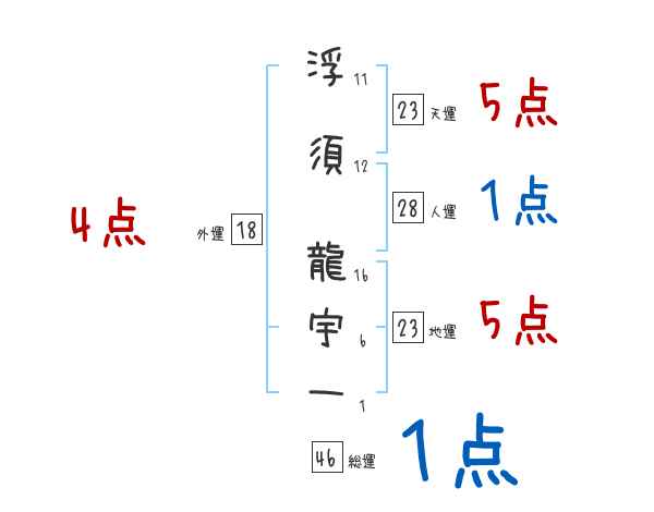 天運![]() | 浮須龍宇一さんの天運は23画の5つ星!想像力に優れ活力がある。一代で成功し名誉を手に入れる。 家系が持つ宿命的な運勢を表します。祖先から受け継いだ苗字ですので自分の力が及びません。家柄を象徴します。 |
