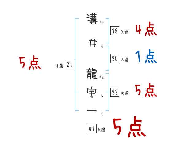 天運![]() | 溝井龍宇一さんの天運は18画の4つ星!情熱的で剛気。忍耐力があり信頼される。 家系が持つ宿命的な運勢を表します。祖先から受け継いだ苗字ですので自分の力が及びません。家柄を象徴します。 |