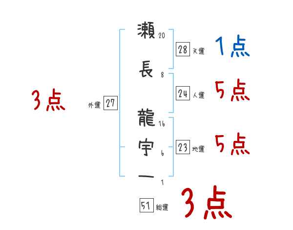 総運![]() | 瀬長龍宇一さんの総運は51画の3つ星!変化が激しく、危険に注意。堅実な性格。 あなたの人生を表す1番重要な運勢です。生涯を通じて影響する総合運となり、主に50歳以降の晩年期に影響を及ぼします。 |