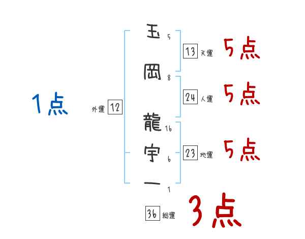 天運![]() | 玉岡龍宇一さんの天運は13画の5つ星!才能に恵まれ人気がある。名声を手に入れる。円満な人生。 家系が持つ宿命的な運勢を表します。祖先から受け継いだ苗字ですので自分の力が及びません。家柄を象徴します。 |