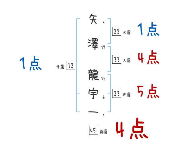 | 人運  | 矢澤龍宇一さんの人運は33画の4つ星!権力志向でプライドが高い。勇気があり運を切り開き成功する。性格や才能などを表す2番目に重要な運勢です。人間関係や協調性、社会的な成功に影響します。主に20歳から50歳ぐらいまでの中年期の運勢を表します。 |