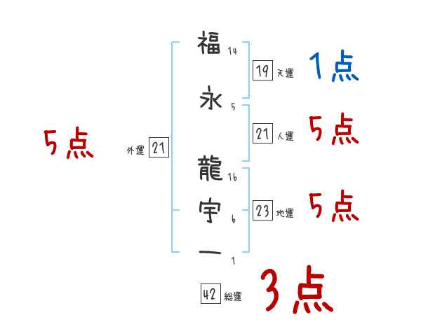 人運![]() | 福永龍宇一さんの人運は21画の5つ星!統率力がある。独立し成功する。名誉を手に入れる。 性格や才能などを表す2番目に重要な運勢です。人間関係や協調性、社会的な成功に影響します。主に20歳から50歳ぐらいまでの中年期の運勢を表します。 |