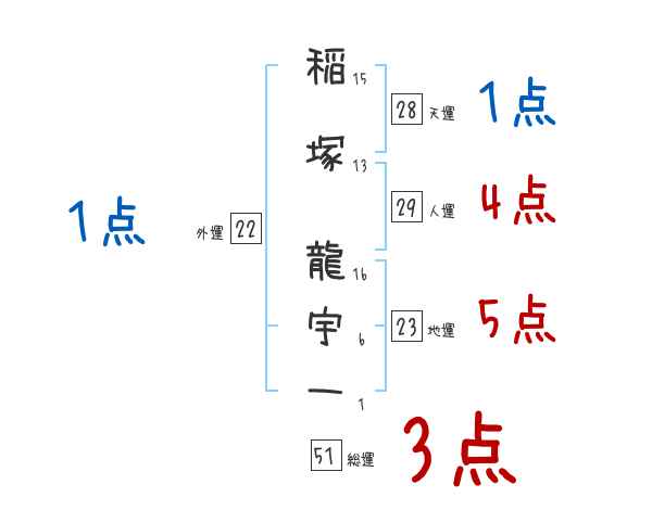 外運![]() | 稲塚龍宇一さんの外運は22画の1つ星!努力することが苦手ないっぽう手先が器用。芸術性にも優れる。 生活面を象徴する運勢です。外部から受ける影響力を表し、結婚運、家庭運や職場、環境への順応性を表します。 |