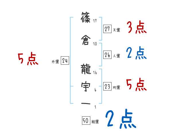 外運![]() | 篠倉龍宇一さんの外運は24画の5つ星!家庭運が良く順調な人生。金運にも恵まれる。 生活面を象徴する運勢です。外部から受ける影響力を表し、結婚運、家庭運や職場、環境への順応性を表します。 |