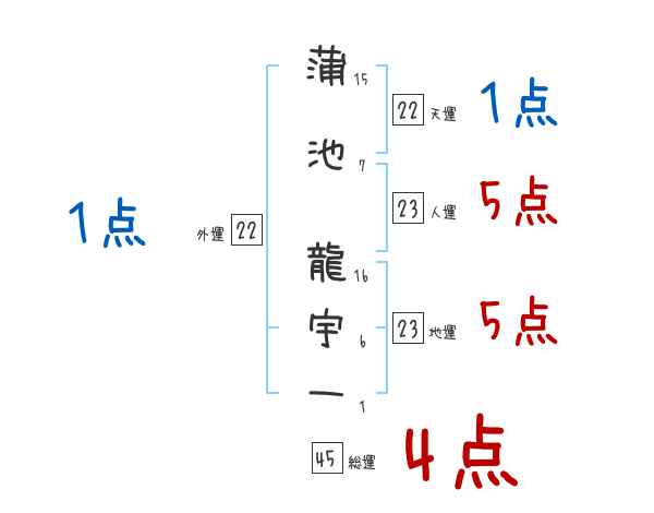天運![]() | 蒲池龍宇一さんの天運は22画の1つ星!努力することが苦手ないっぽう手先が器用。芸術性にも優れる。 家系が持つ宿命的な運勢を表します。祖先から受け継いだ苗字ですので自分の力が及びません。家柄を象徴します。 |