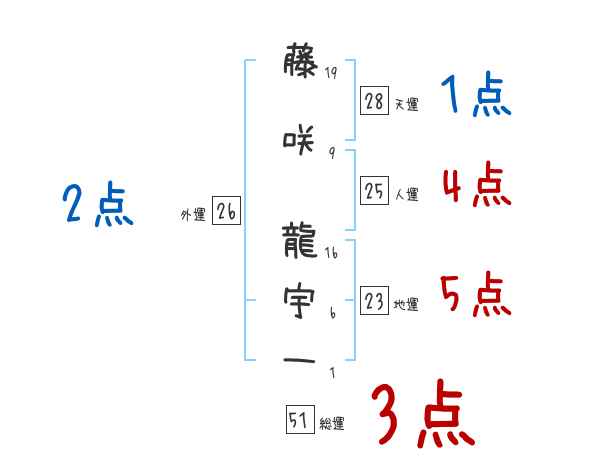 天運![]() | 藤咲龍宇一さんの天運は28画の1つ星!家庭環境に注意。スポーツで活躍できる能力があるかも。 家系が持つ宿命的な運勢を表します。祖先から受け継いだ苗字ですので自分の力が及びません。家柄を象徴します。 |
