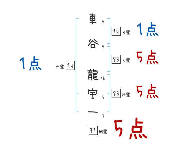 天運![]() | 車谷龍宇一さんの天運は14画の1つ星!人に対して優しいがストレスを溜め込みがち。人間関係のトラブルを避けるよう気をつけましょう。 家系が持つ宿命的な運勢を表します。祖先から受け継いだ苗字ですので自分の力が及びません。家柄を象徴します。 |