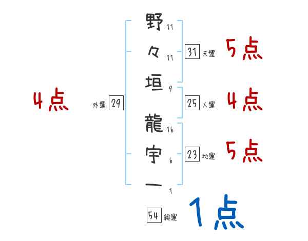 天運![]() | 野々垣龍宇一さんの天運は31画の5つ星!社交性があり判断力に優れる。順風満帆な人生で円満な生活。 家系が持つ宿命的な運勢を表します。祖先から受け継いだ苗字ですので自分の力が及びません。家柄を象徴します。 |
