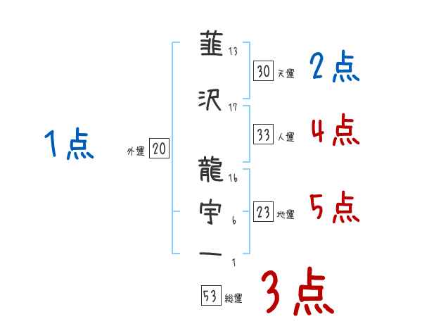 天運![]() | 韮沢龍宇一さんの天運は30画の2つ星!浮き沈みの激しさに注意しましょう。 家系が持つ宿命的な運勢を表します。祖先から受け継いだ苗字ですので自分の力が及びません。家柄を象徴します。 |